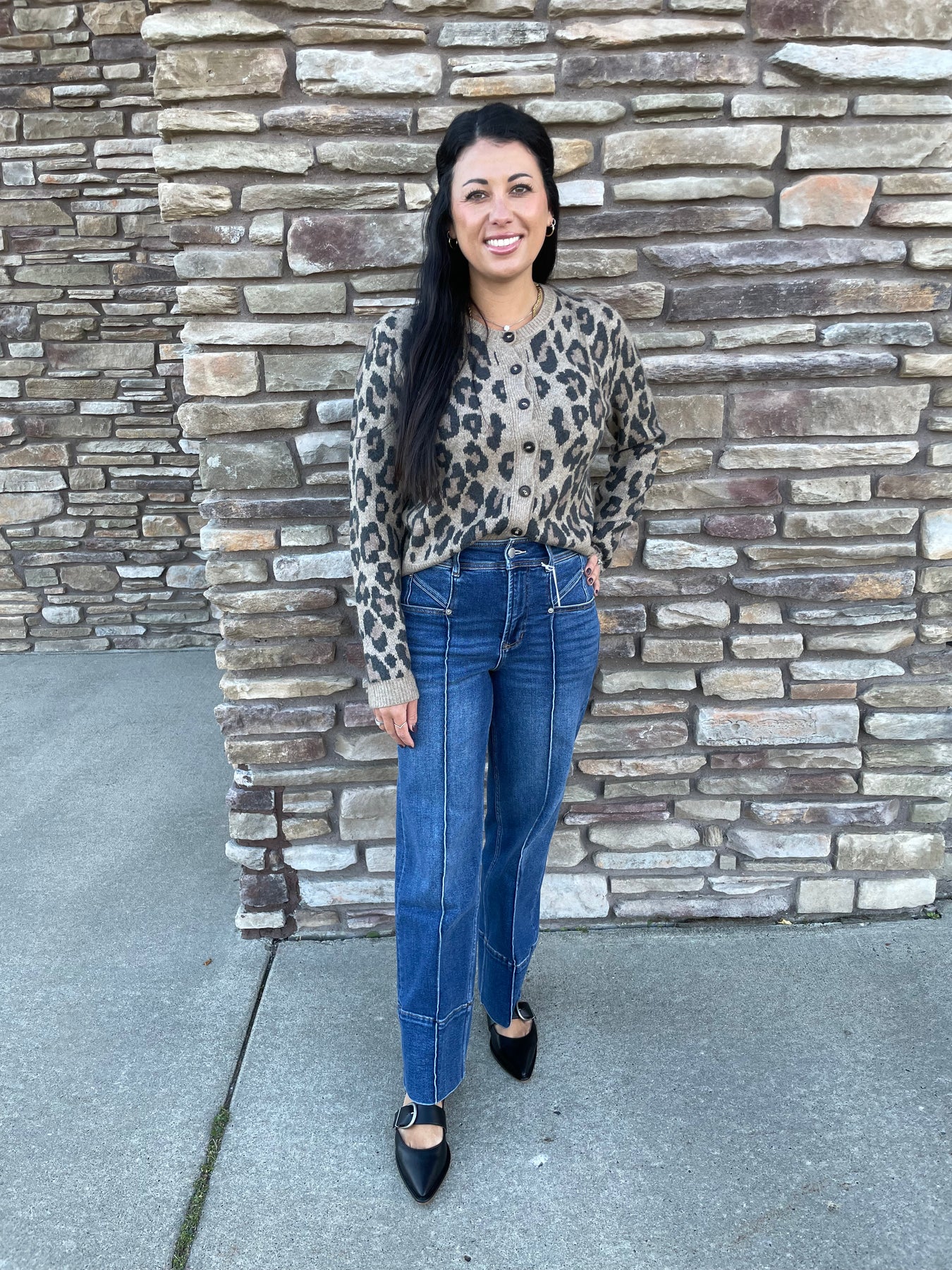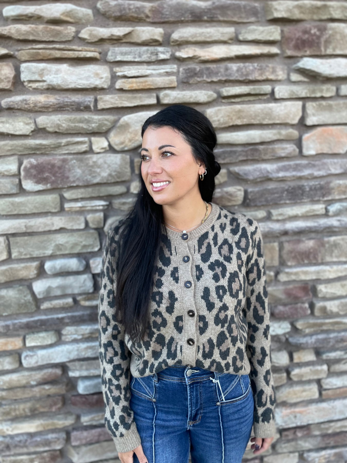 This desert tan leopard print cardigan offers versatile styling options—wear it buttoned up as a cozy sweater or open as a chic layering piece. Its neutral tones and bold pattern bring effortless edge to your wardrobe while providing comfortable warmth. Ideal for transitioning between seasons, it combines fashion-forward design with practical versatility.