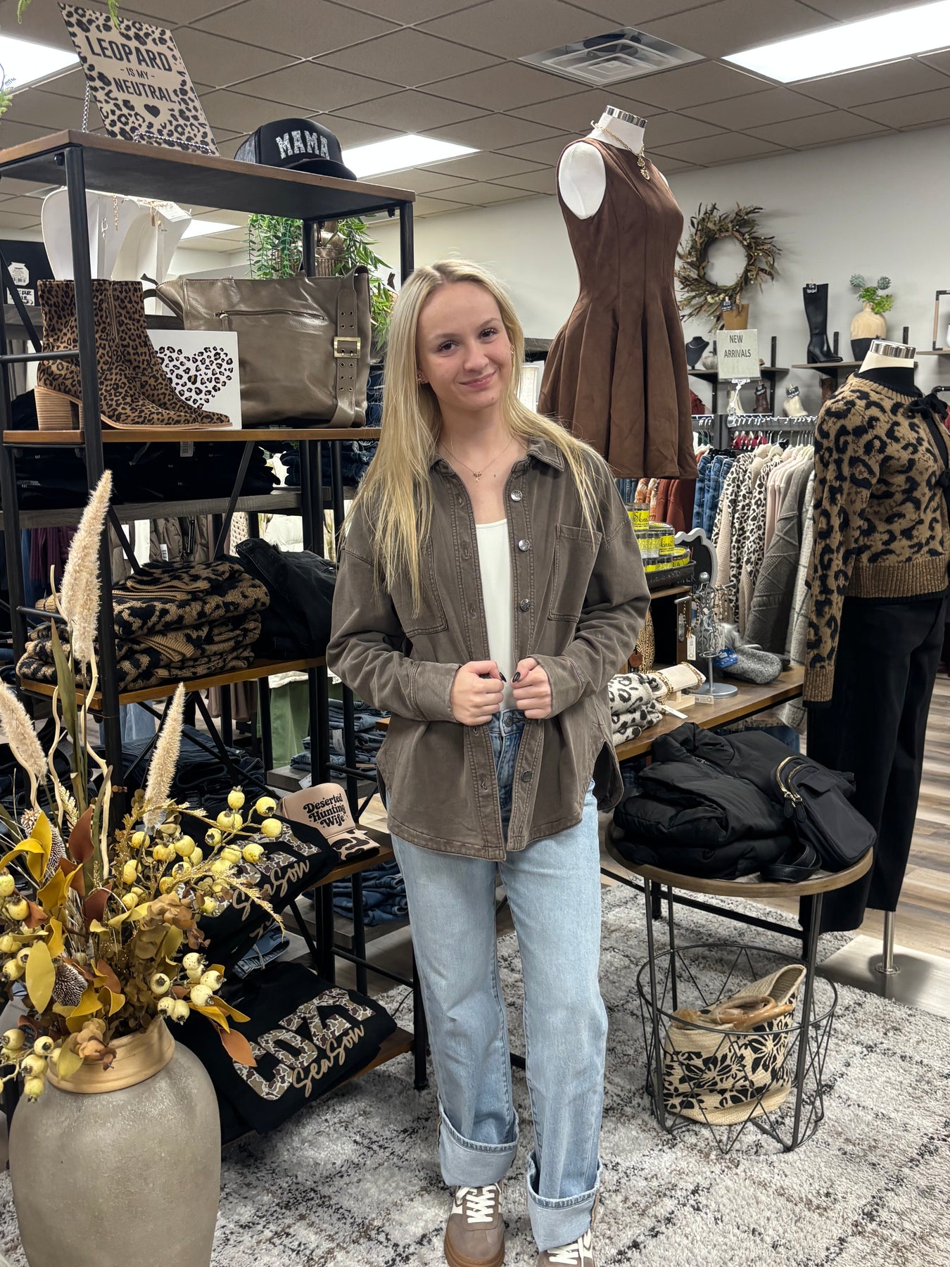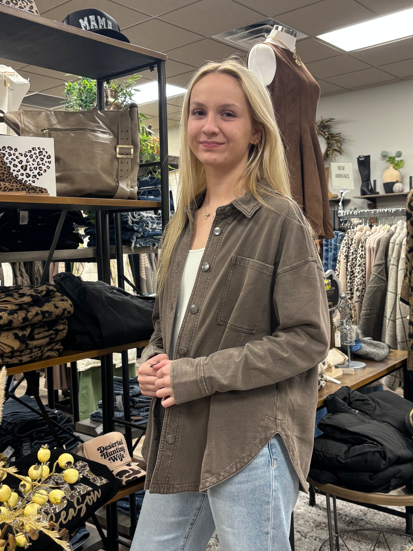 Elevate your layering game with this versatile washed button-up jacket in rich coffee tones. The relaxed shacket silhouette bridges the gap between shirt and jacket, offering effortless styling for transitional seasons. Crafted with a soft, lived-in finish, it pairs seamlessly with everything from casual tees to dresses. The classic button front and structured shoulders provide polished appeal, while the comfortable fit ensures all-day wearability. A wardrobe essential that works as hard as you do.