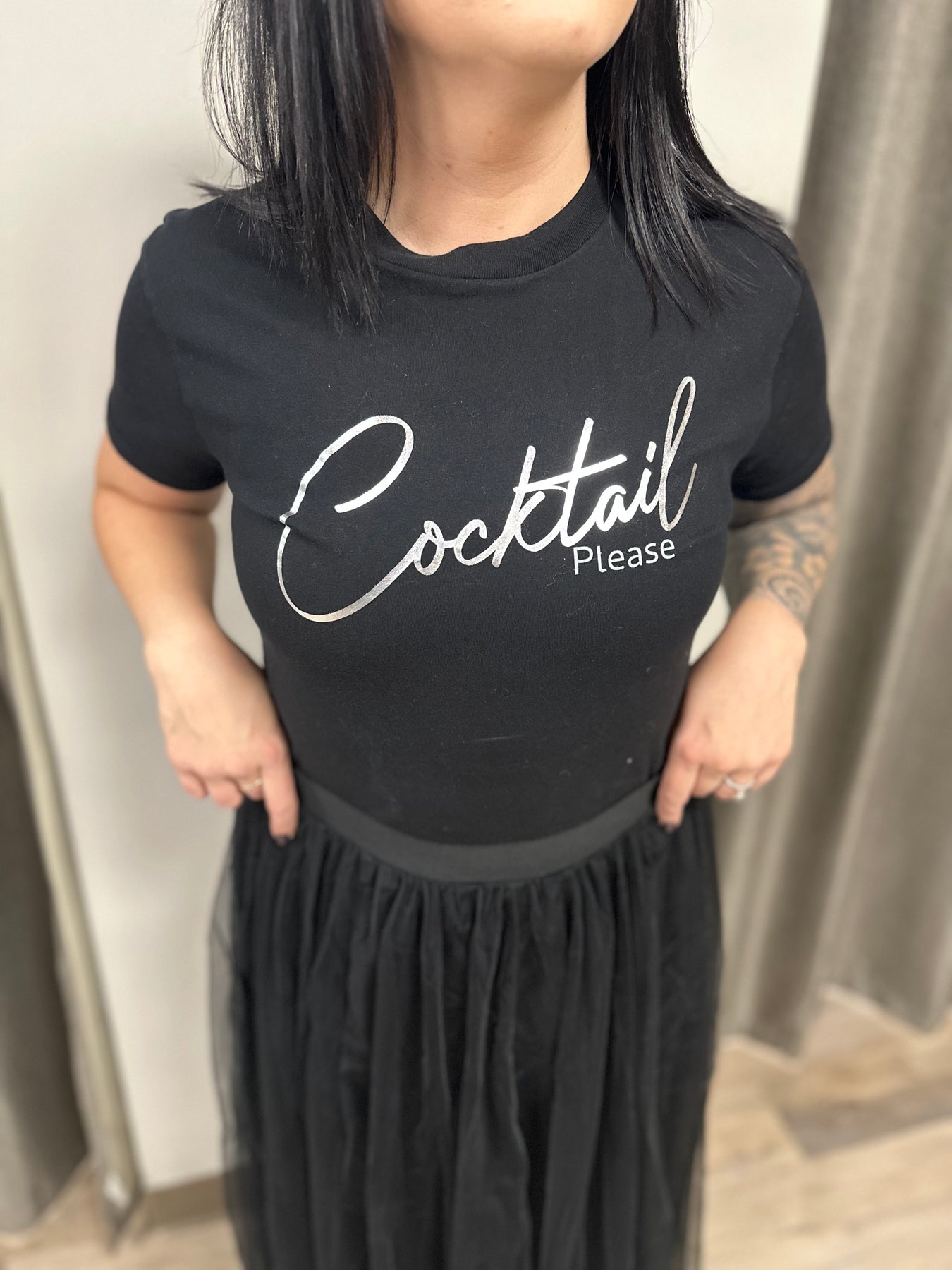Make a statement with this striking black graphic tee featuring bold metallic lettering that reads "COCKTAIL PLEASE." The shimmering text adds an upscale touch to an everyday essential, perfect for casual outings or relaxed social gatherings. Crafted for comfort and style, this piece effortlessly transitions from day to night, letting your personality shine through with a hint of sophistication and wit.