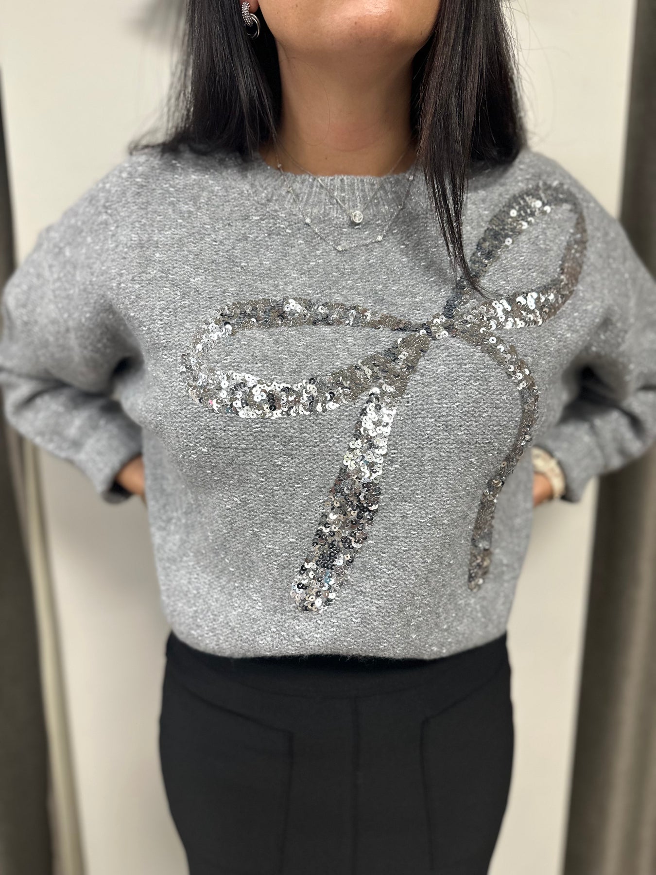 Elevate your wardrobe with this sophisticated ELAN bow sweater, featuring shimmering silver sequin detailing that catches the light beautifully. The signature bow accent adds a refined, feminine touch perfect for both casual outings and polished occasions. Crafted with quality construction, this grey sweater seamlessly transitions from day to evening wear. The sequin embellishment provides just the right amount of sparkle without overwhelming your look, making it an ideal choice for those who appreciate understated elegance with a touch of glamour.