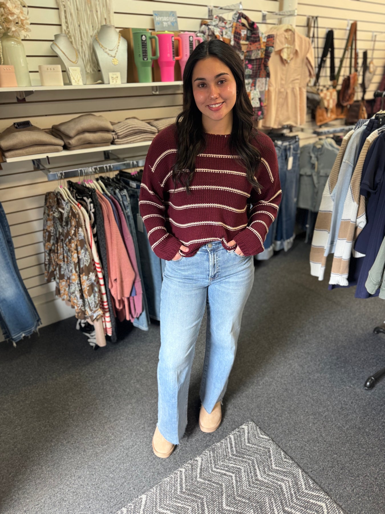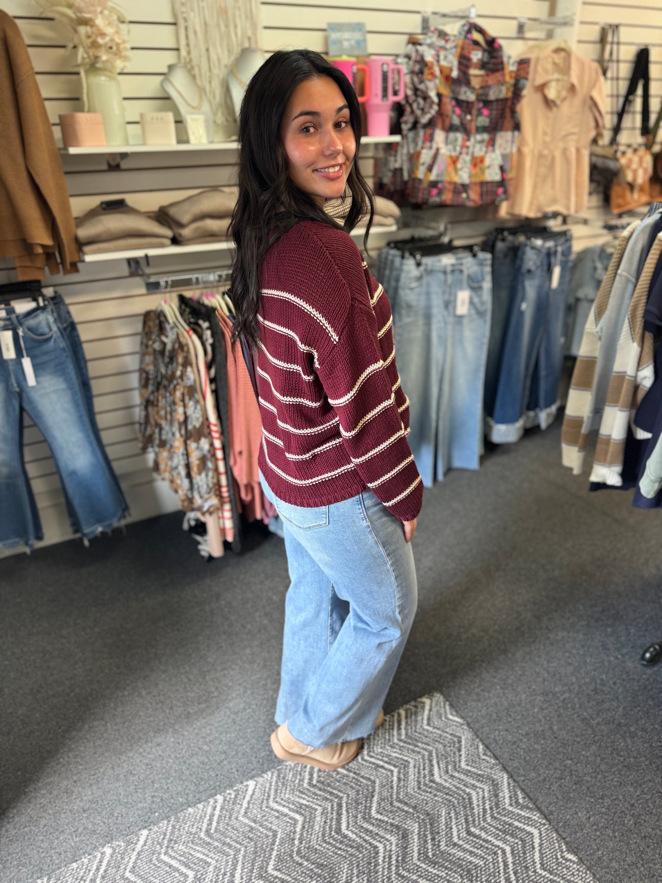 This expertly crafted striped sweater combines classic crochet techniques with a rich wine and cream color palette for a timeless look. The breathable stitch pattern ensures comfort and versatility, making it ideal for layering across seasons. Durable and stylish, it brings artisanal quality to your wardrobe with its carefully balanced design and texture.