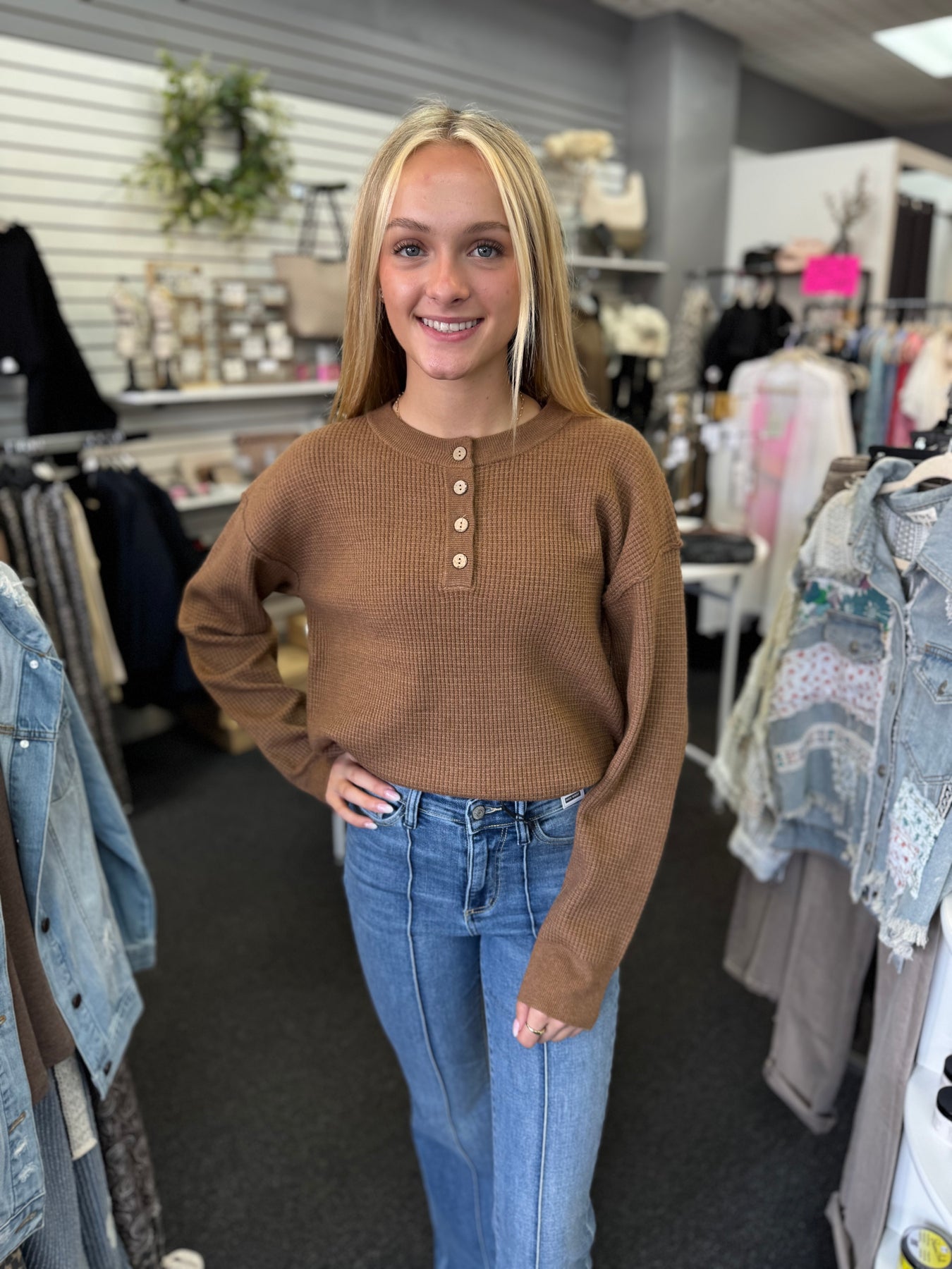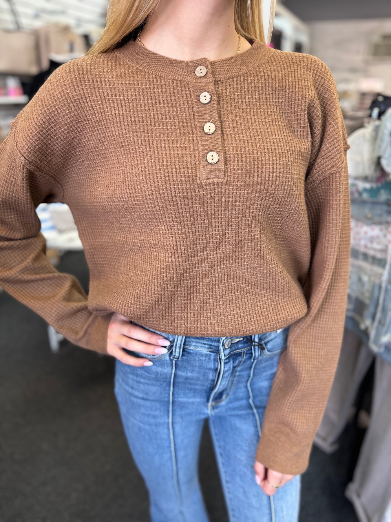 This brown waffle sweater features a sophisticated button-up neckline, adding a structured touch to its cozy texture. The waffle knit provides warmth and breathability, making it an ideal layering piece for cooler days. Its versatile design pairs seamlessly with both casual and refined outfits, offering comfort without compromising style.