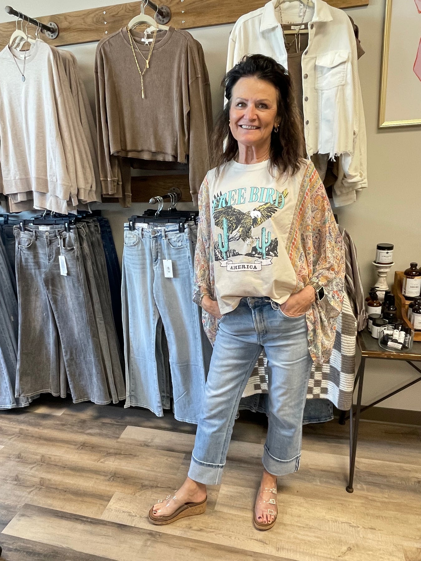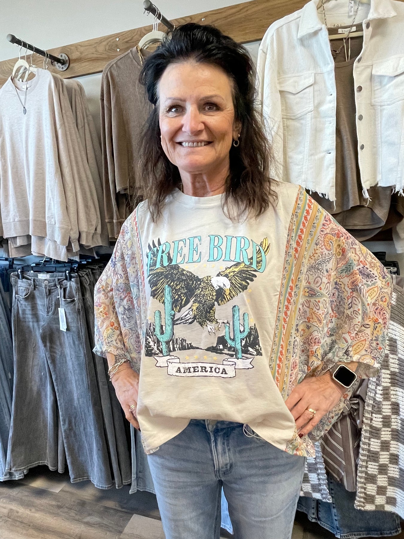 The Free Bird Kaftan Tee in Bone features an updated graphic design that enhances visual appeal while maintaining comfort. Its kaftan style offers a relaxed fit, making it suitable for various body types. Ideal for casual wear, this tee combines aesthetic versatility with functional wearability.