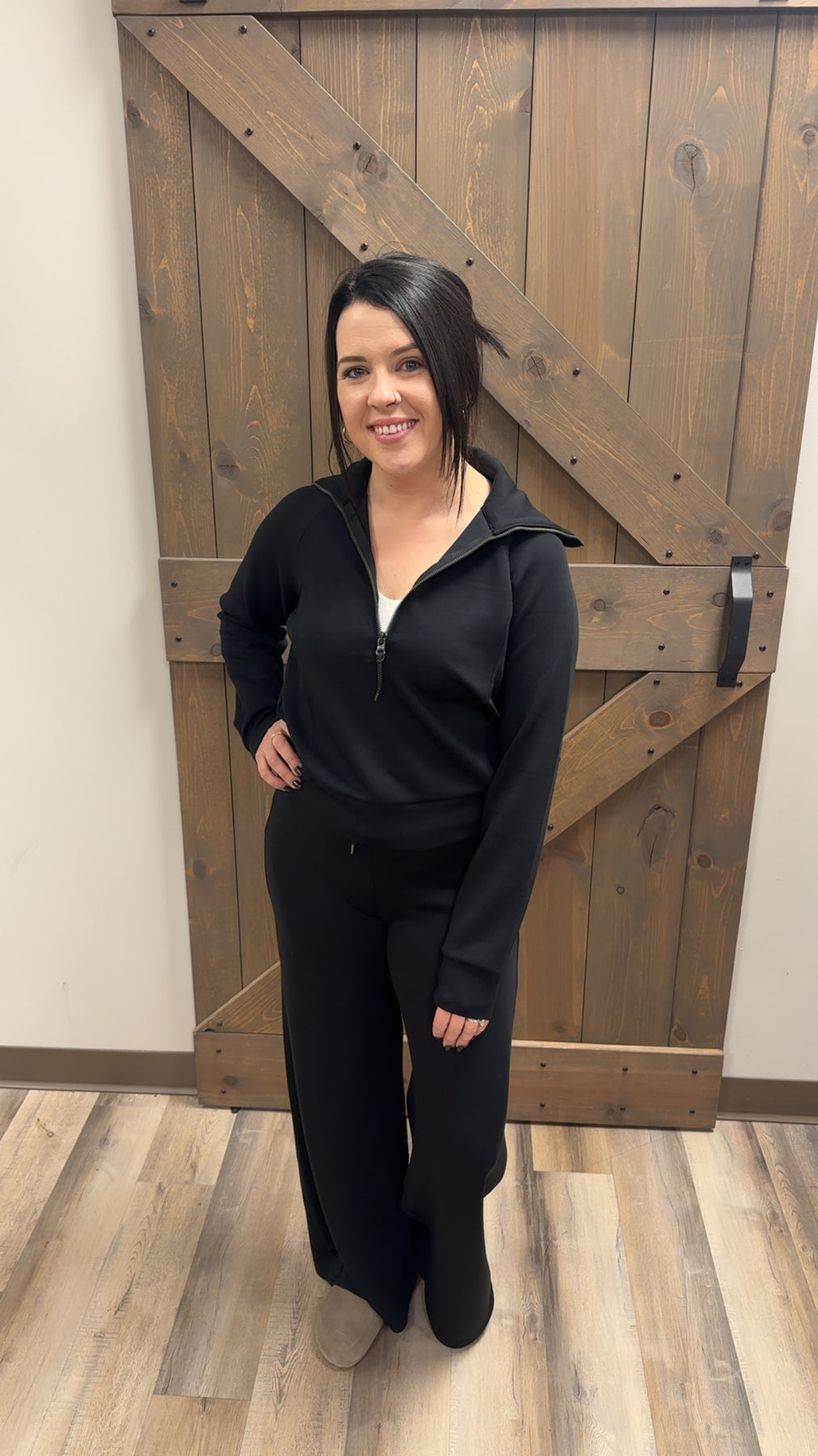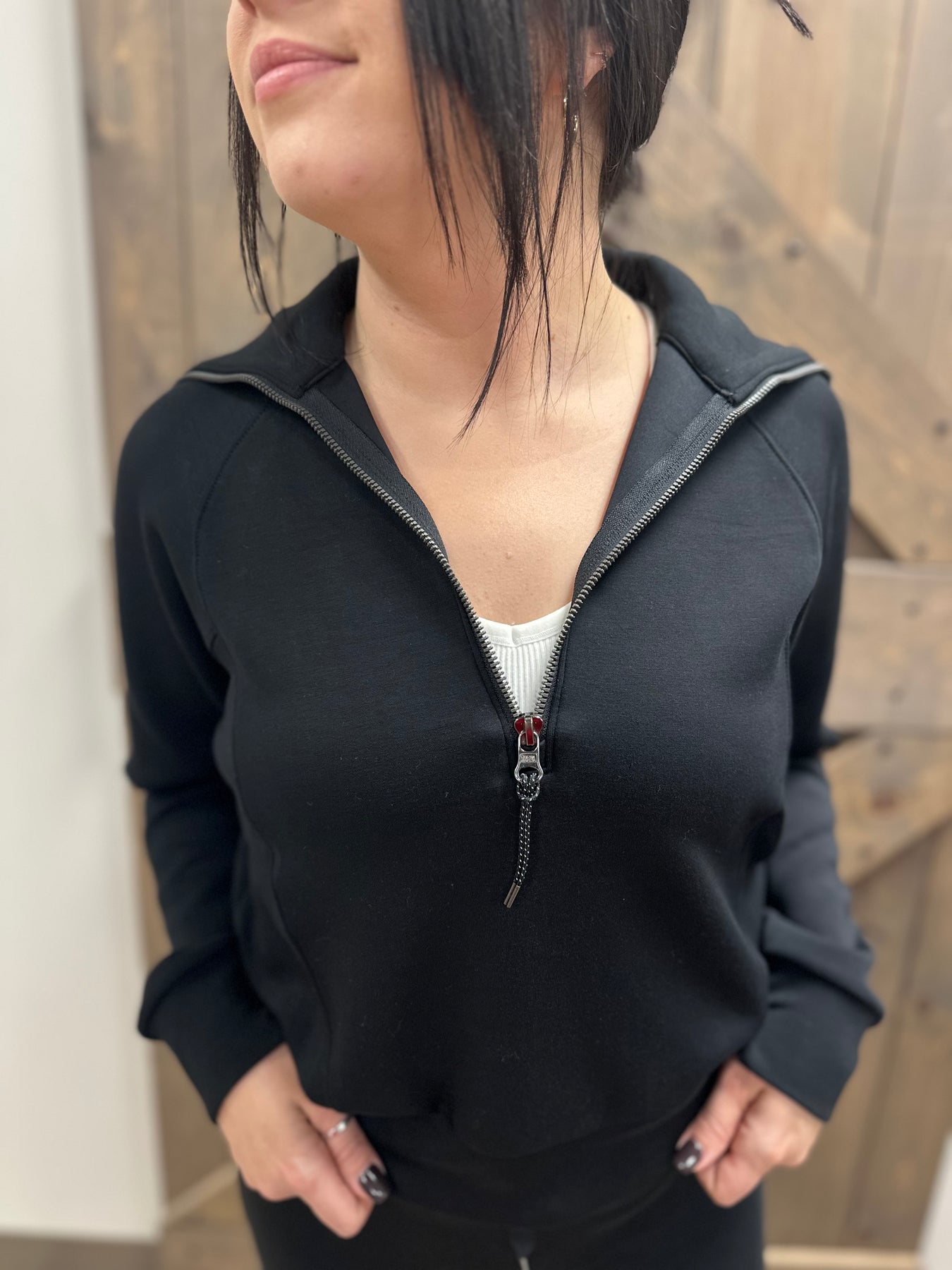 The SPANX Half Zip Top in black delivers effortless sophistication with its soft, breathable construction designed for all-day comfort. This versatile essential features a quarter-zip neckline for easy layering and temperature control, making it an ideal piece for transitional seasons or casual layering. The premium fabric provides a smooth, flattering fit while maintaining its shape through repeated wear. Perfect for pairing with everything from tailored trousers to weekend denim, this timeless black top elevates any wardrobe with understated elegance and practical wearability.