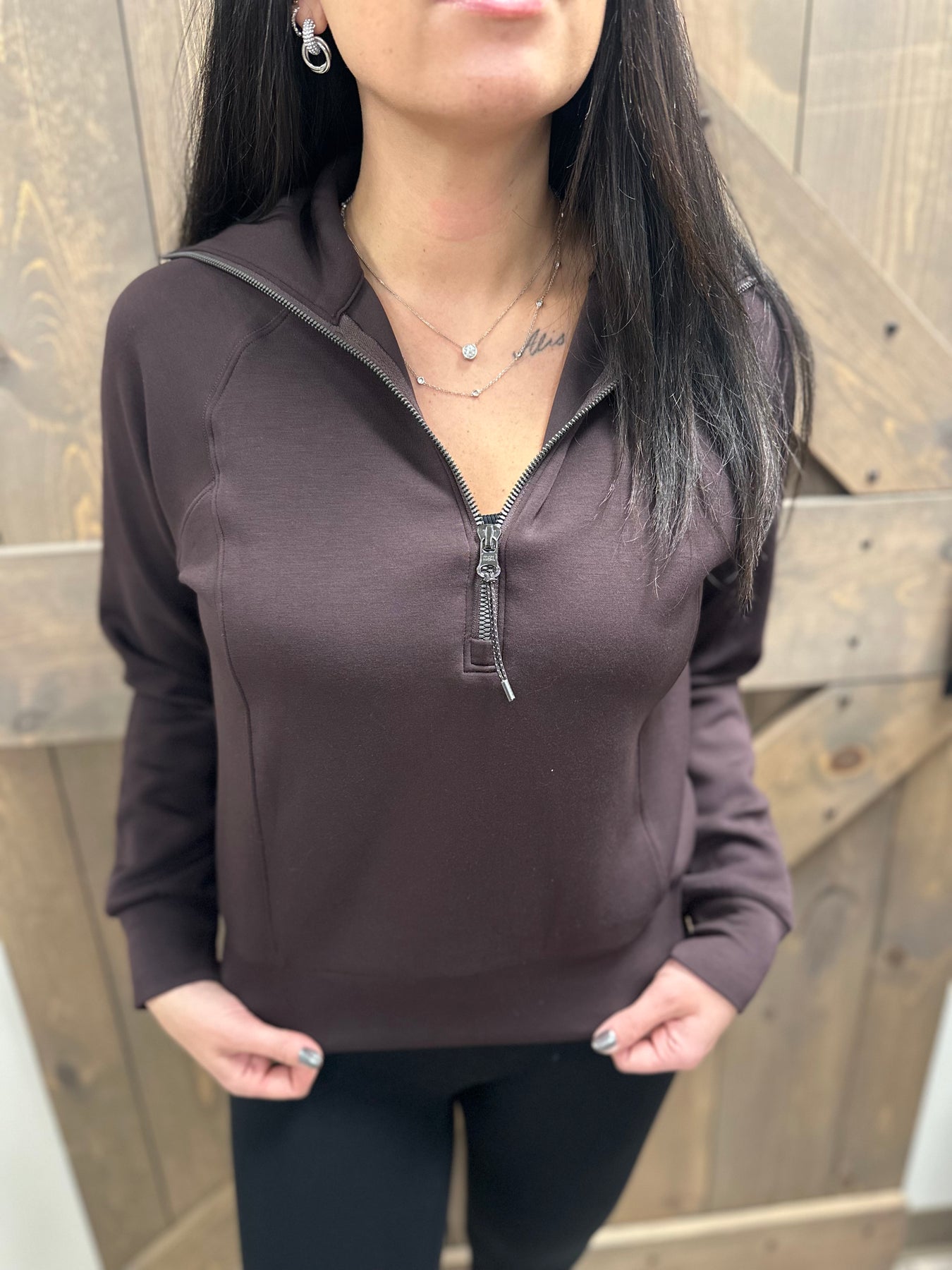 The SPANX Half Zip Top in brown delivers effortless comfort with a versatile design that transitions seamlessly from casual to polished. This essential layer features a relaxed fit and breathable fabric that moves with you throughout your day. The half zip construction offers easy layering and temperature control, making it an ideal choice for building a functional wardrobe. Perfect for pairing with everything from jeans to tailored trousers, this timeless piece combines practicality with understated sophistication.